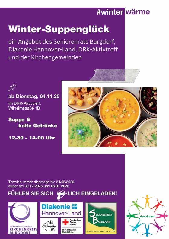 Wie in den vergangenen Jahren ist das Winter-Suppenglück eine gemeinschaftliche Aktion, an der neben dem Seniorenrat auch der Diakonieverband Hannover-Land, die Burgdorfer Kirchengemeinden und der DRK-Ortsverein Burgdorf beteiligt sind.